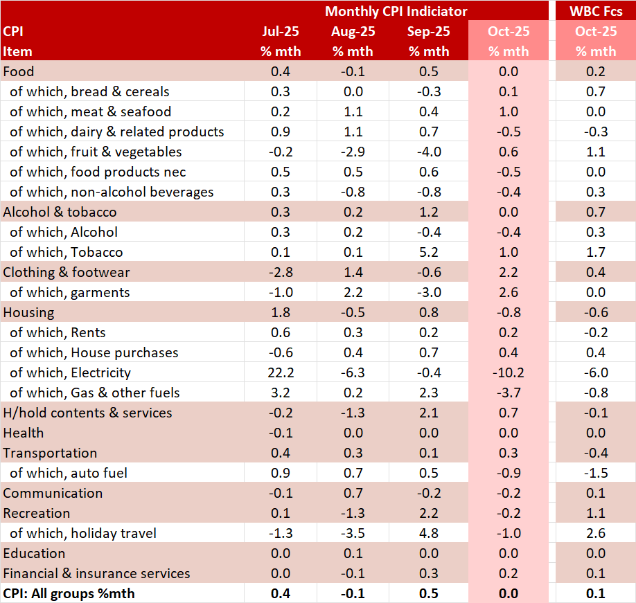 The CPI Indicator was flat in the month, a touch softer than Westpac’s published near-cast of 0.1% on the back of a larger than expected decline in electricity (–10.2%) only partially offset by smaller than expected decline in auto fuel (–0.9%) and an unexpected bump up in garments (+2.6%).